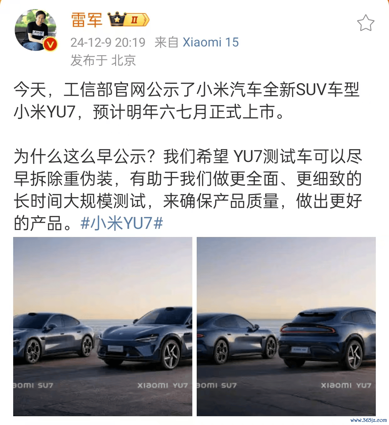 在这次公示中,小米汽车的首款SUV车型小米YU7备受珍重。这款中大型SUV展望将于来岁五六月份认真上市,竞争敌手直指特斯拉Model Y。小米集团董事长雷军在微博上默示,提前超半年技巧进行公示,有助于小米进行更全面、更缜密的长技巧大限度测试,以确保家具性量。从工信部露出的信息来看,小米YU7的长、宽、高鉴识达到4999mm、1996mm、1600mm,轴距为3米,能源电板由江苏时间提供。