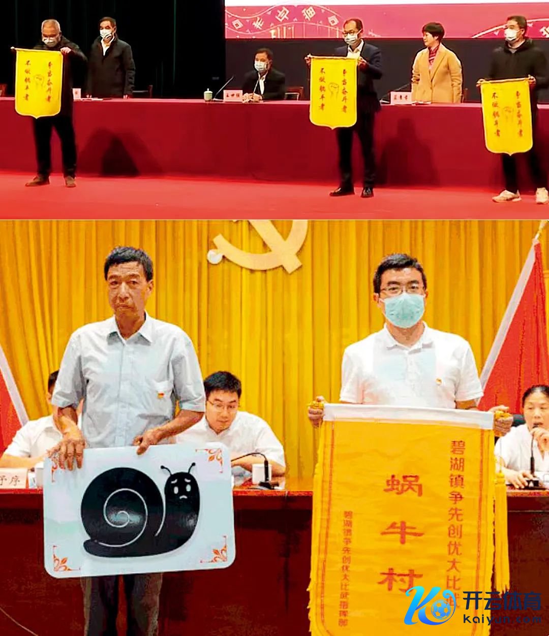 上图:(视频截图)2022年2月,浙江丽水市景宁县发展鼎新局、标溪乡、天然资源行政规矩队3个单元和州里获评该县首批“躺平者”被授予了黄旗。下图:江苏、浙江的部分城市竖立了“蜗牛奖”。