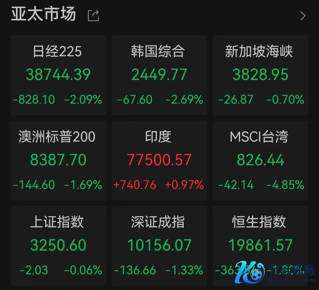 收场发稿,MSIC亚洲新兴指数跌超2%。日经225指数和韩国概括指数均跌超2%,MSCI台湾指数跌超4%,香港恒生指数亦受累赘跌1.8%。
