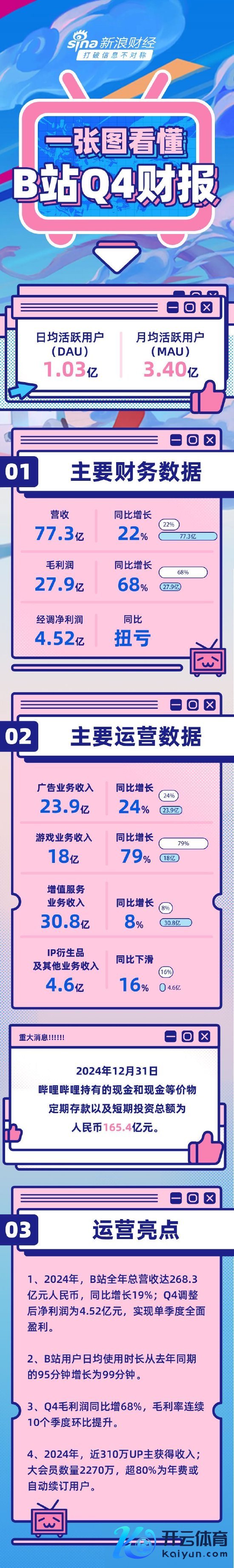 B站发布2024年第四季度财报:营收77.3亿元(告白23.9亿+游戏18亿+升值工作30.8亿+IP繁衍品过甚他4.6亿),同比增长22%。诊治后净利润为4.52亿元,杀青单季度全面盈利。在第四季度,B站日活数目和月活跃用户数隔离达到1.03亿和3.4亿,用户平均每天在B站消耗99分钟。