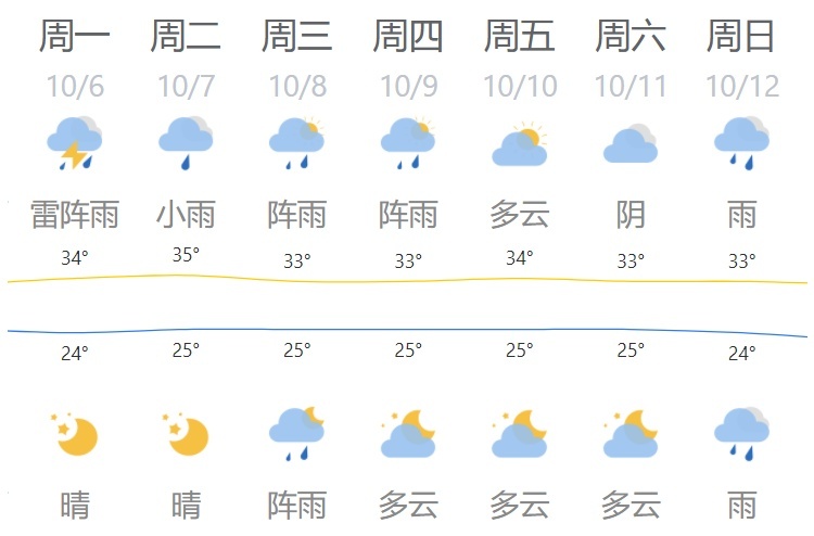 7-9日,受弱冷空气影响,有阵雨,气温24℃~33℃。
