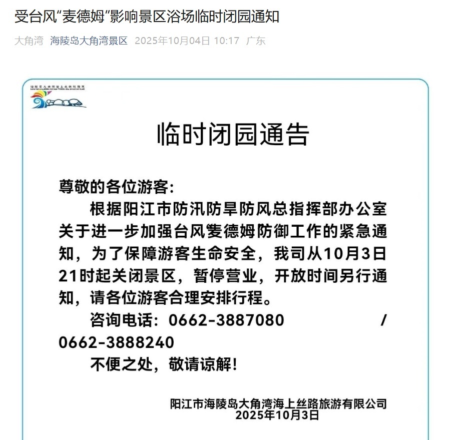 中国第一滩景区已于10月4日17:00临时关闭,广东茂名丛林公园从10月4日18:00起实行临时闭园,茂名露天矿生态公园、茂名露天矿博物馆10月5日0时起接纳临时闭园、闭馆步调,柏桥荔博园景区于10月5日9时起临时闭园,茂名狂妄海岸海外旅游度假区10月4日傍晚起暂不欢迎门票类来宾入园,塘霞俚街10月4日17:00起临时关闭,电白区博物馆、茂名陈金章好意思术馆10月4日下昼17:00起闭馆。具体复原通达时辰,视天气情况另行见告。