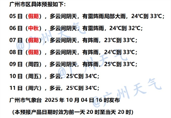 6日,多云间阴天,有雷阵雨,24℃~32℃;中秋夜以多云到晴为主,可见蟾光;