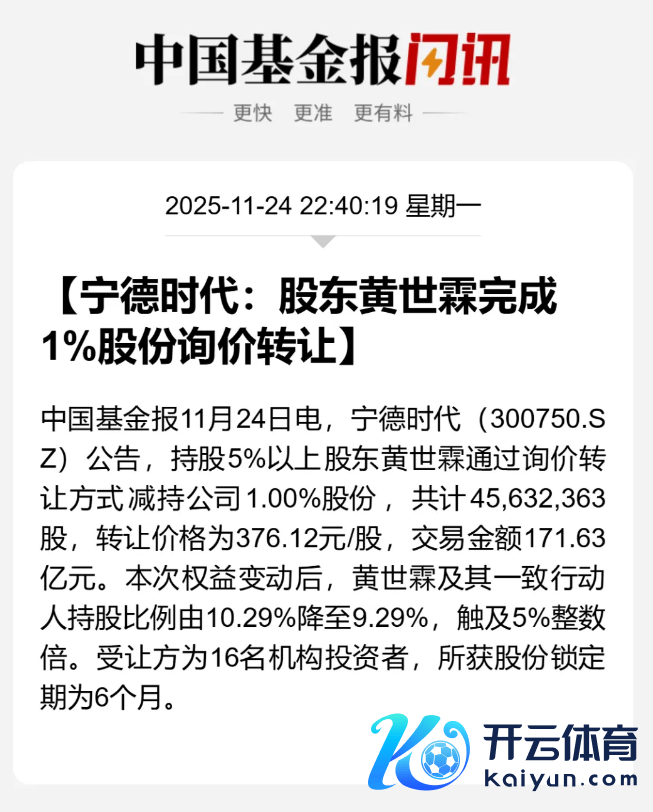 11月24日晚间,宁德时期发布公告称,公司抓股5%以上推动黄世霖已完成询价转让1%股份的来往,询价转让价钱为376.12元/股,来往金额为171.63亿元,受让方为16家机构投资者。