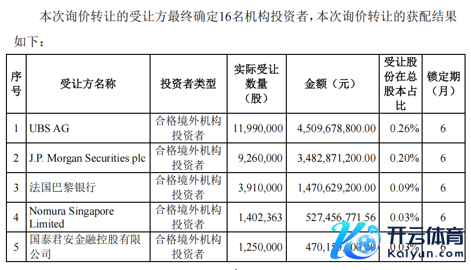 把柄机构投资者申购报价情况,并严格按照《认购邀请书》中详情的询价转让价钱、询价对象及获配股票的技巧和公法,详情本次询价转让的价钱为376.12元/股,转让股份数目为4563.24万股,来往金额达171.63亿元。