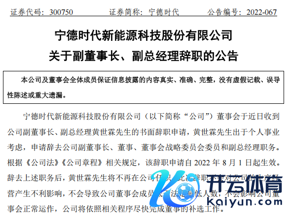 公告剖析,黄世霖出于个东谈主行状有计划,央求辞去宁德时期副董事长、董事、董事会政策委员会委员和副总司理职务。