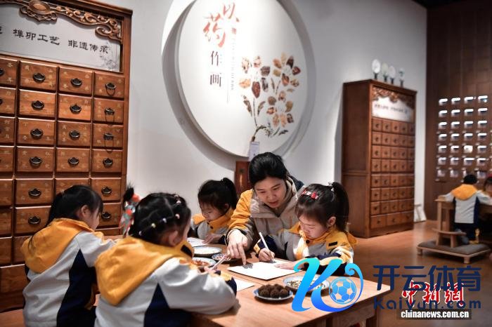 12月16日,河北安国中医药文化博物馆,小一又友体验“以药作画”。中新社记者 翟羽佳 摄