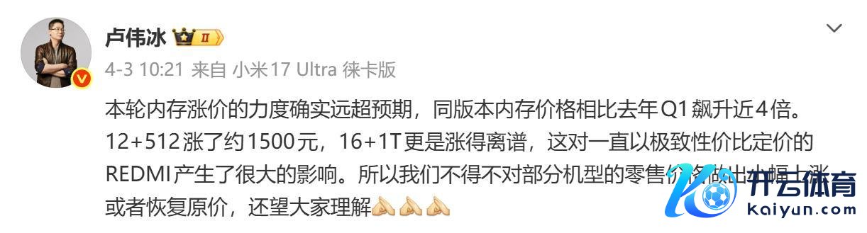 其实加价这事吧,小米总裁卢伟冰早在几个月前就打过“退避针”了。折服寰球伙齐知谈,随同全球存储芯片价钱飙升,内存、闪存这些本钱涨得那叫一个离谱。不出不测的话,手机行业合座齐会随着水长船高。是以卢伟冰其时话语也挺实在:扛不住也会涨。