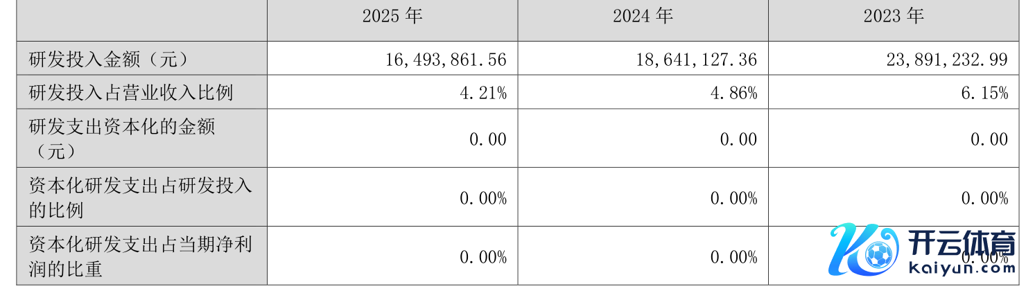 2025年全年,公司研发参加金额为1649.39万元,同比下落11.52%;研发参加占生意收入比例为4.21%,比拟上年同时下落0.65个百分点。此外,公司全年研发参加成本化率为0%。